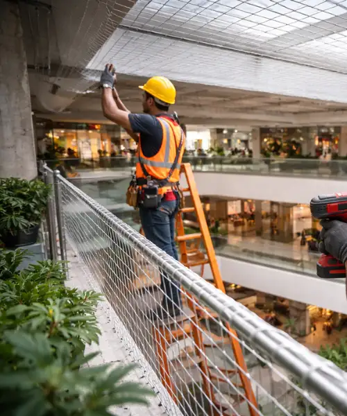 For factory and warehouse roofs, we typically use heavy-duty HDPE or knotted nylon net (25mm–50mm mesh) installed on a GI pipe frame system. The frame spans structural columns and roof trusses, supporting the net without wall drilling. For light-frame industrial roofs, we use SS cable tensioning.